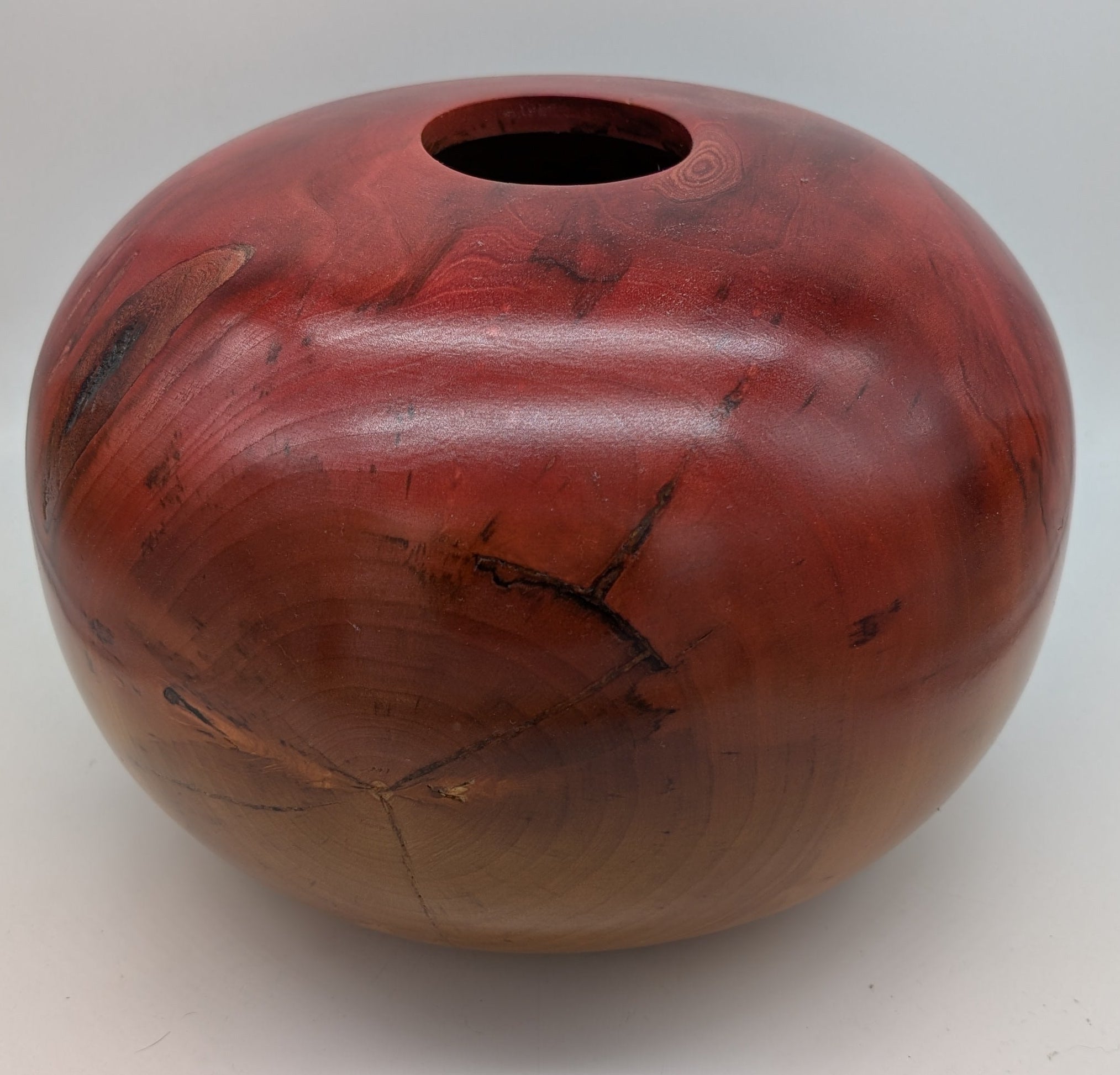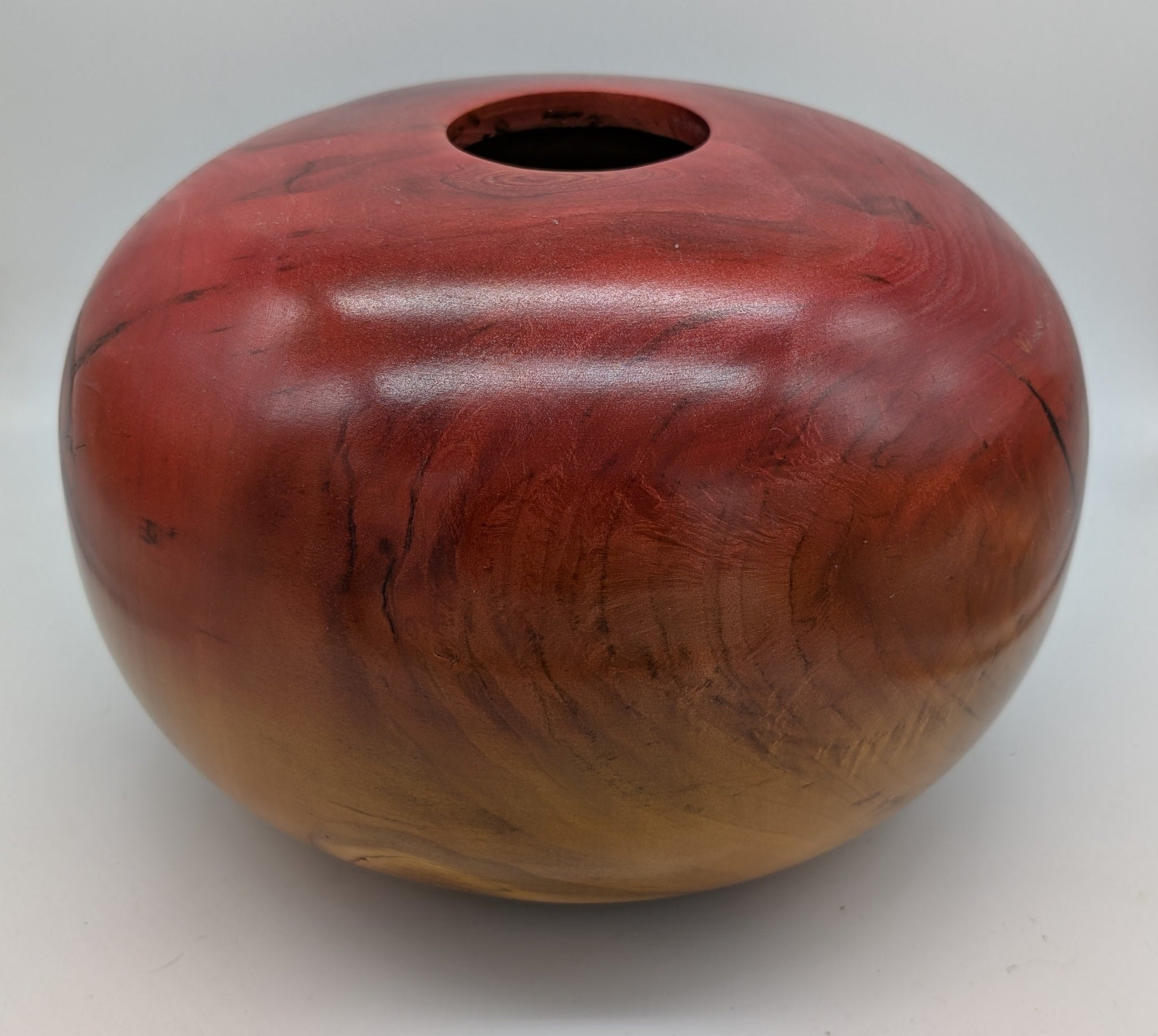 This one-of-a-kind hollow form is turned from English Sycamore and finished in a satin varnish to bring out the natural beauty of the grain. The surface is carefully coloured in a reverse cherry-burst gradient, transitioning from deep, rich reds through warm tones into the natural pale wood. The result is a smooth, flowing form that draws the eye and invites closer inspection.