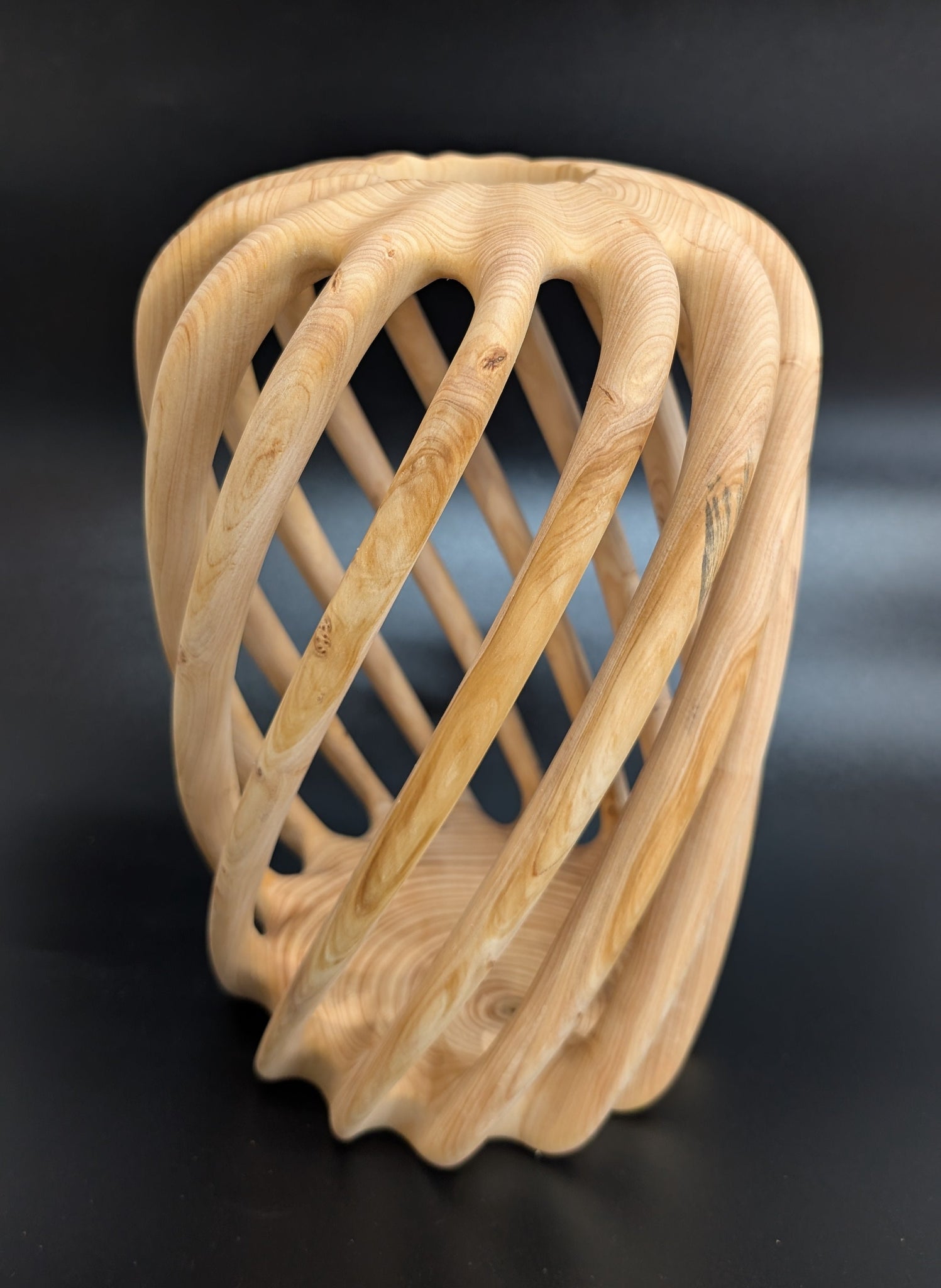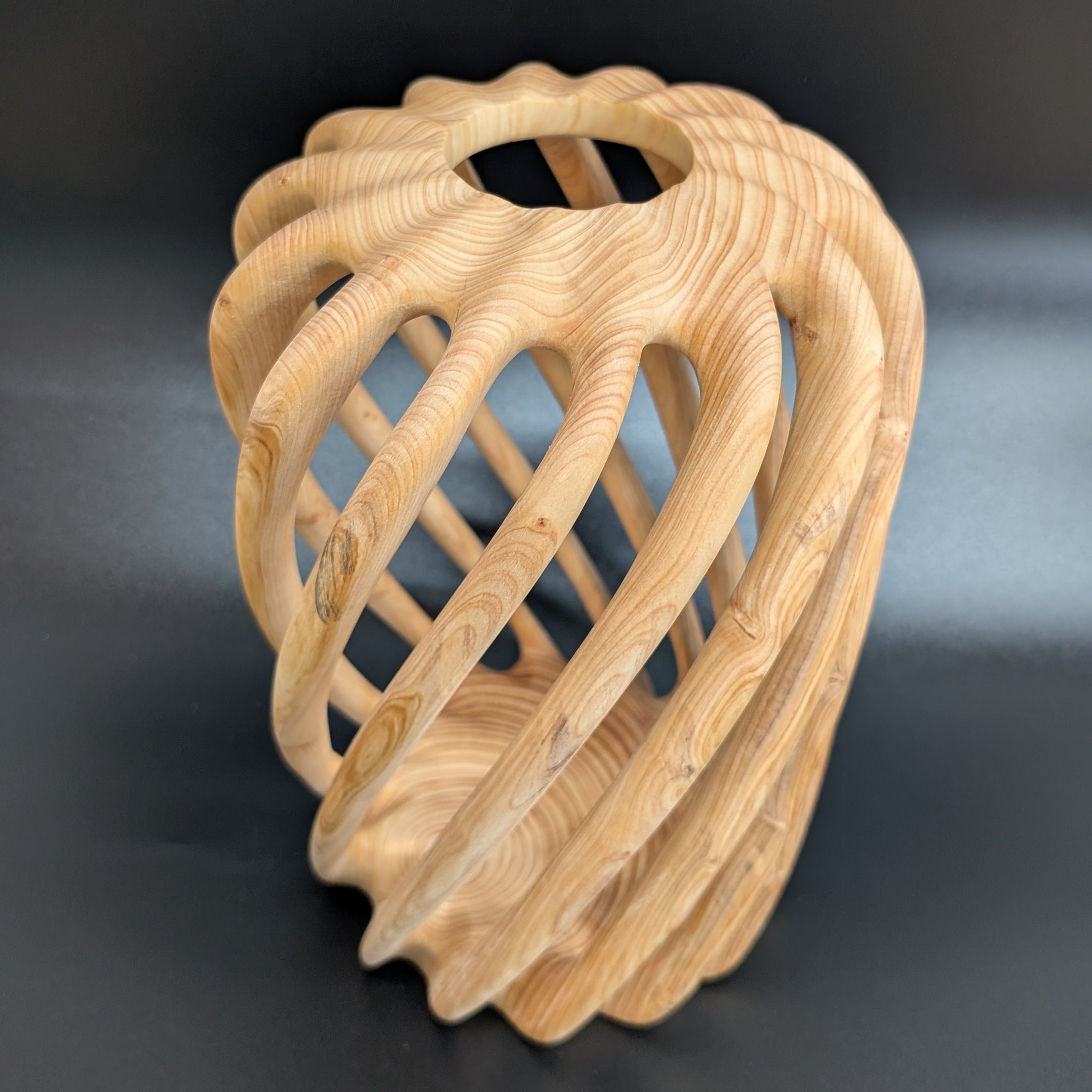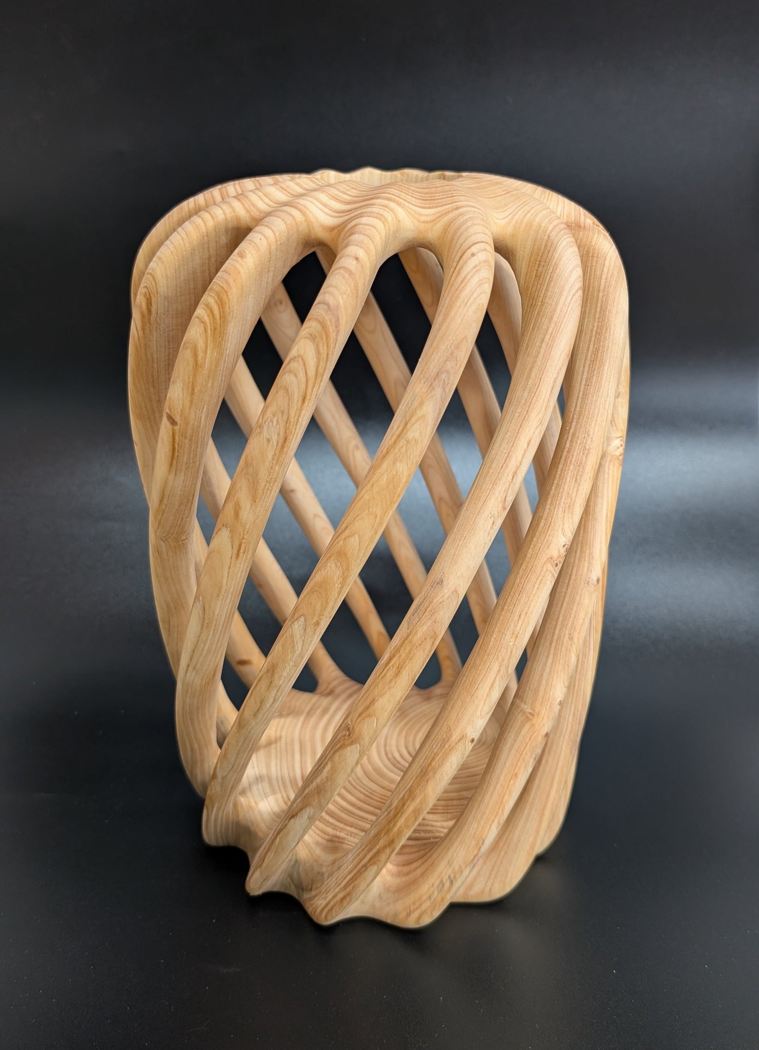 The spiral cuts create a sense of motion, while the hollowed body suggests both fragility and strength a vessel that feels alive, as if it might continue to unfurl.